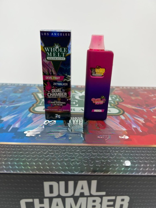 Experience two strains in one device. The Dual Chamber Devil Fruit by Whole Melt combines intense, layered flavor with powerful live resin extracts in a single 2-gram dual-chamber disposable—switch or blend on demand for a tailor-made session